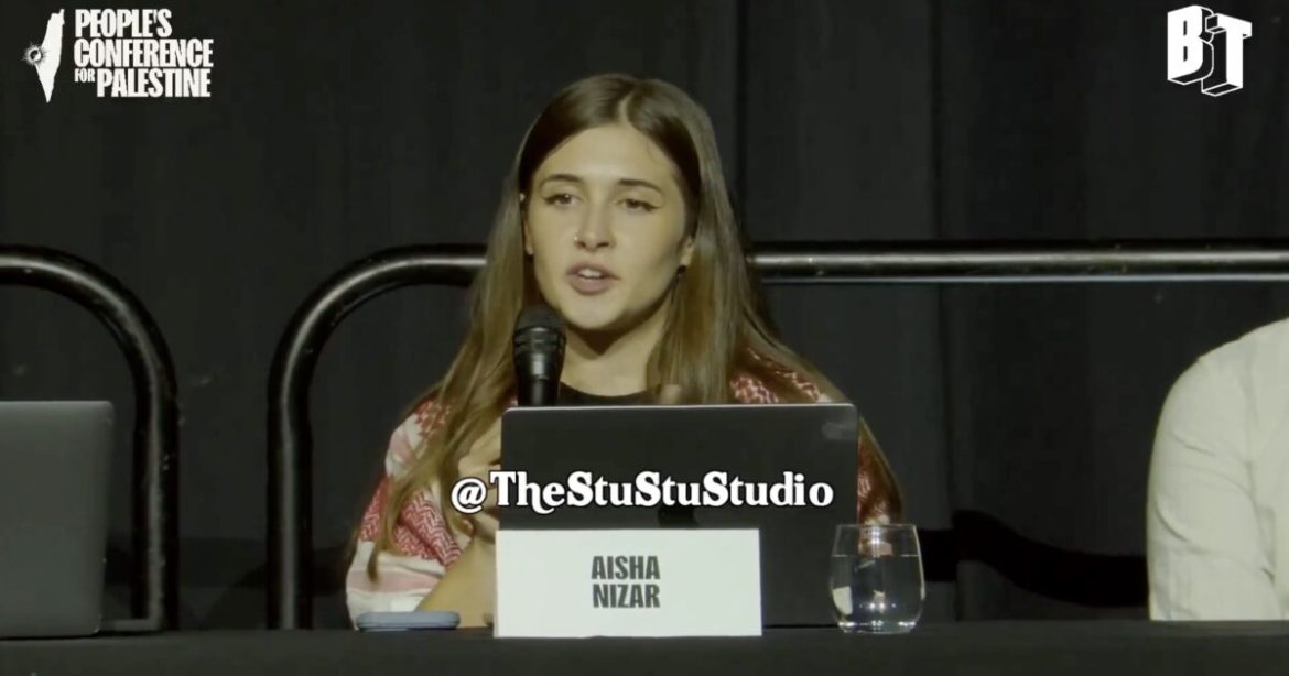 Aisha Nizar speaking at the radical People’s Conference for Palestine in Detroit (Screenshot: BreakThrough News / Youtube)