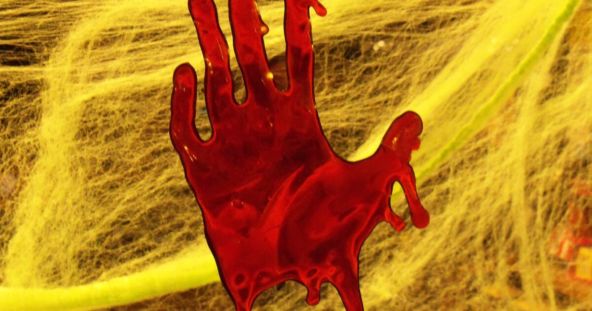 Red handprint on a yellow spider web background, creating a spooky atmosphere suitable for Halloween decorations.